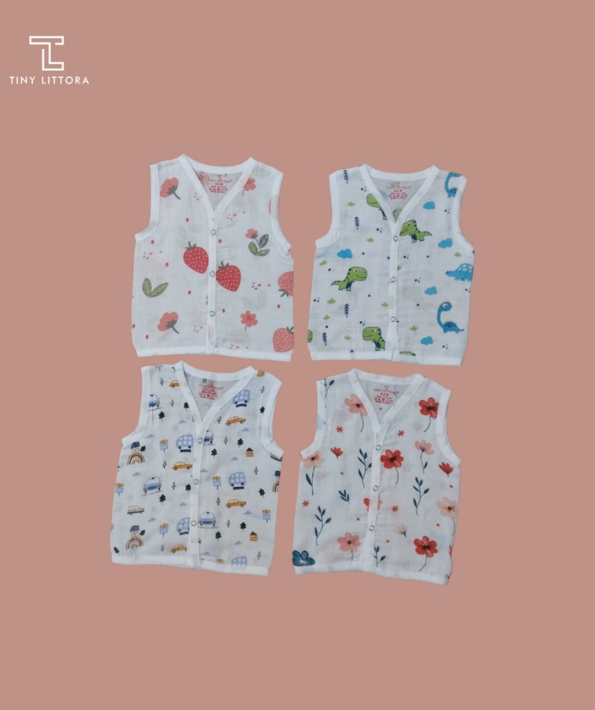 The front button closure makes dressing and diaper changes quick and hassle-free, while the sleeveless design ensures ease of movement. Perfect for daily wear, playtime, or sleep, this pack of 4 offers both convenience and value, with cute colors and prints that add charm to your baby’s wardrobe.